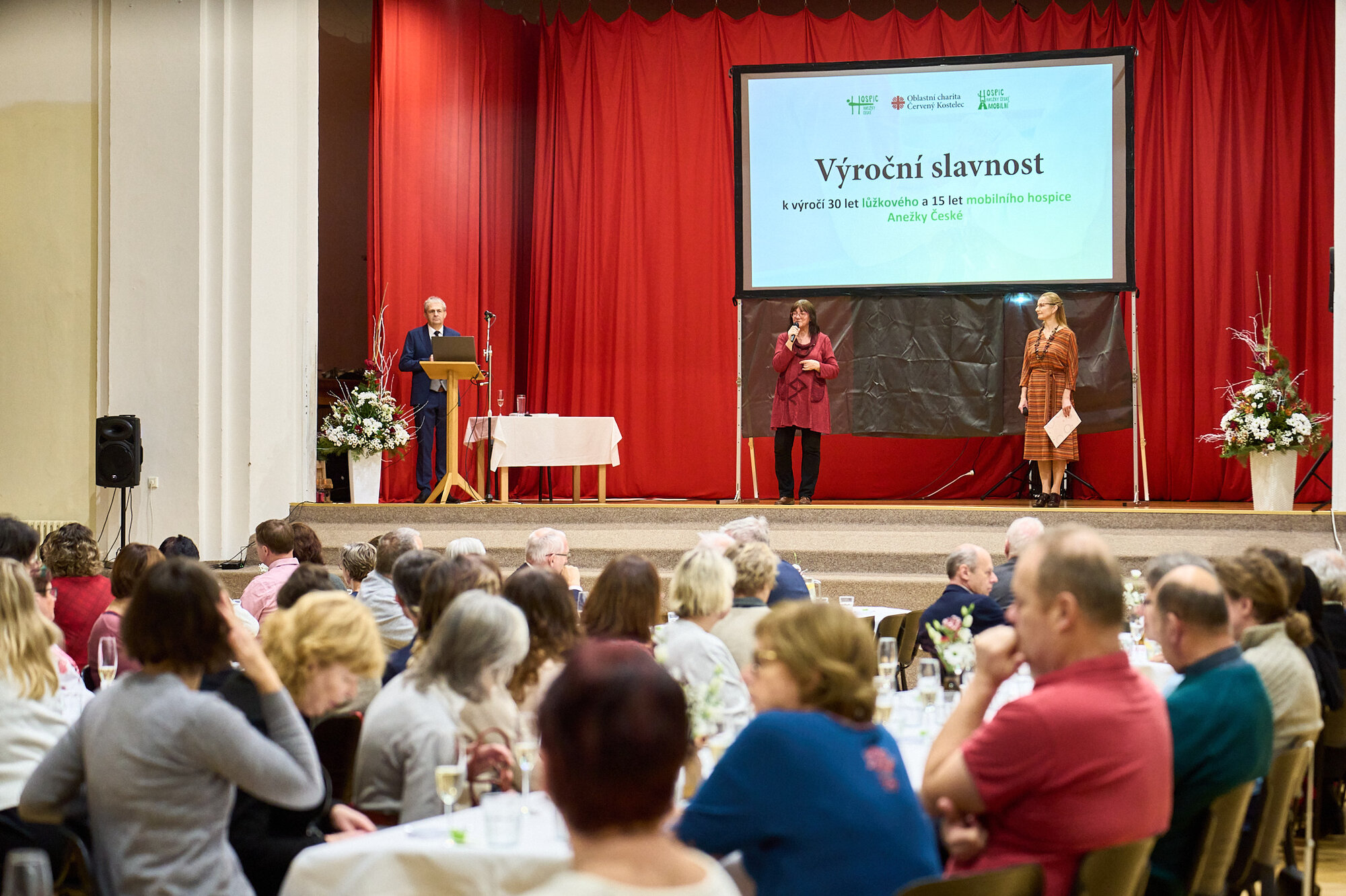 Slavnostní den začal dopolední mší v kostele sv. Jakuba většího v Červeném Kostelci, kterou celebroval Mons. Zdenek Wasserbauer, pomocný biskup pražský. O hudební doprovod se postaral mužský pěvecký sbor Schola Gregoriana Pragensis. Po slavnostní mši se účastníci přesunuli do červenokostelecké sokolovny. Tam následovalo uvítání, krátký přípitek a slavnostní raut pro všechny pozvané hosty. Následovali prezentace jednotlivých přednášejících, ve kterých jsme se ohlédli na počátek hospicové péče u nás, dále byla mapována současná situace paliativní medicíny v České republice a současně byly popsány vize a výzvy do budoucna. Velkou pozornost si získaly historické fotografie zachycující stavbu hospice a jeho první roky existence. Oficiální část programu nabídla také vzpomínky osobností, které stály u zrodu hospice i těch, kdo tvoří dnešní tým. Vystoupili zakladatelé i současní představitelé lůžkové a mobilní péče a své zkušenosti sdíleli také zástupci profesních organizací. Pan Miroslav Wajsar – ředitel Oblastní charity Červený Kostelec představil také nový projekt přístavby nového křídla hospice.