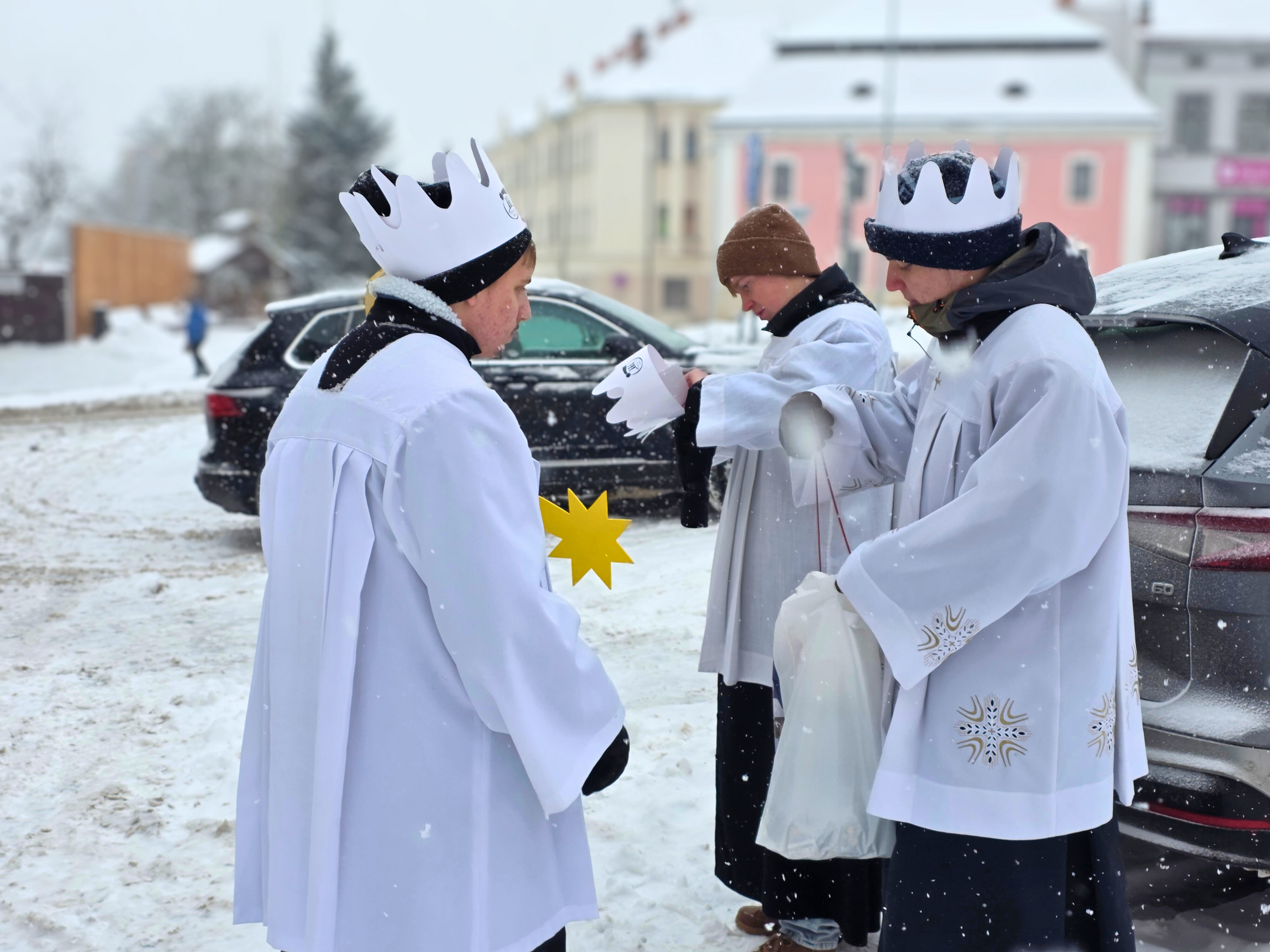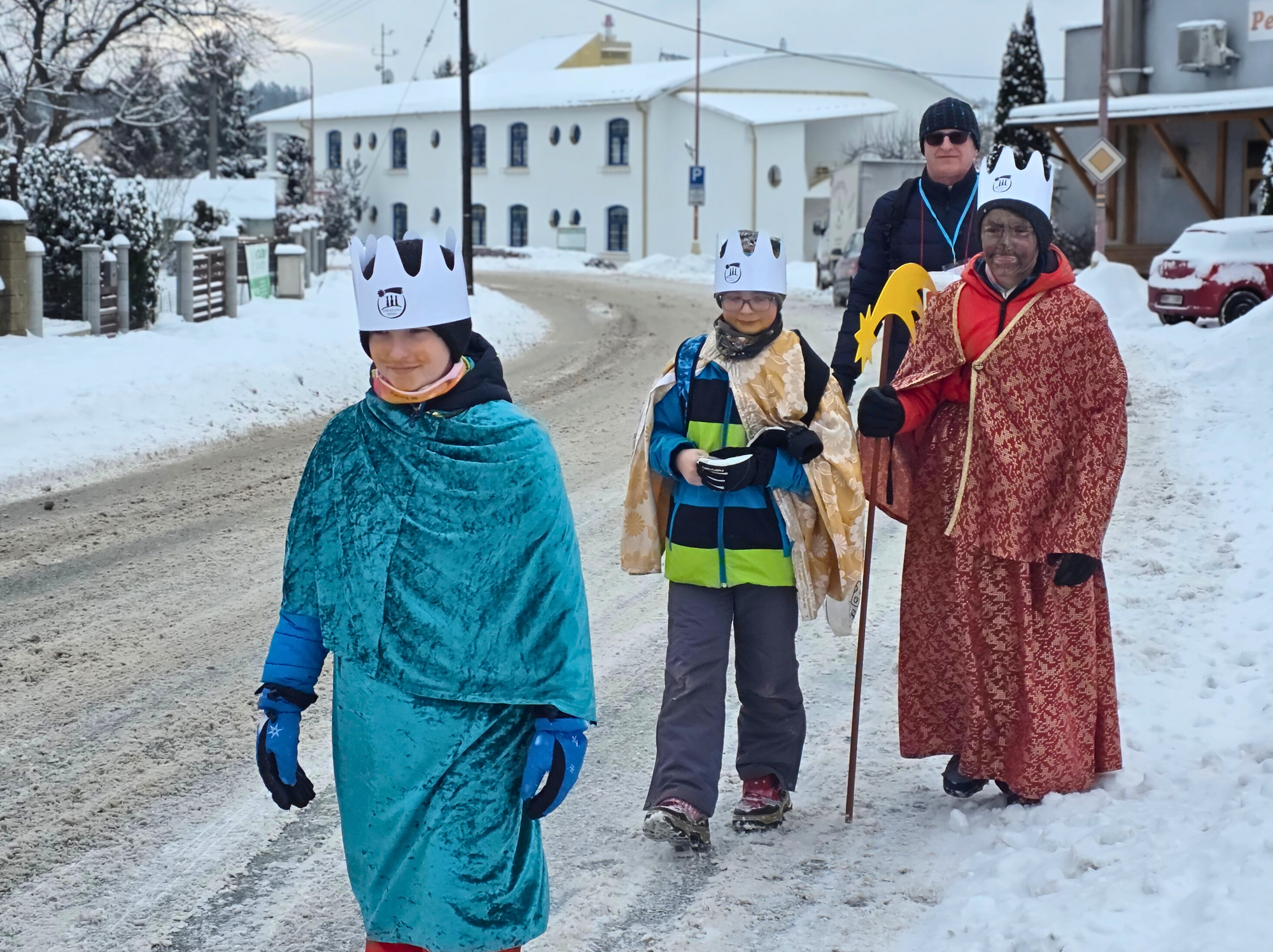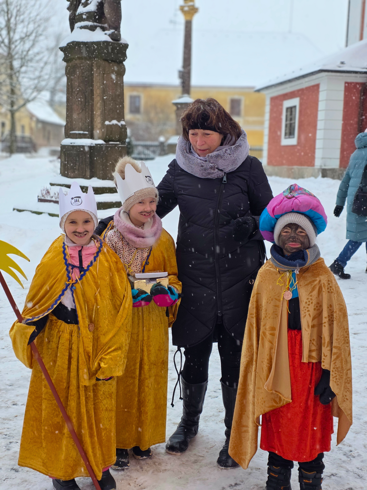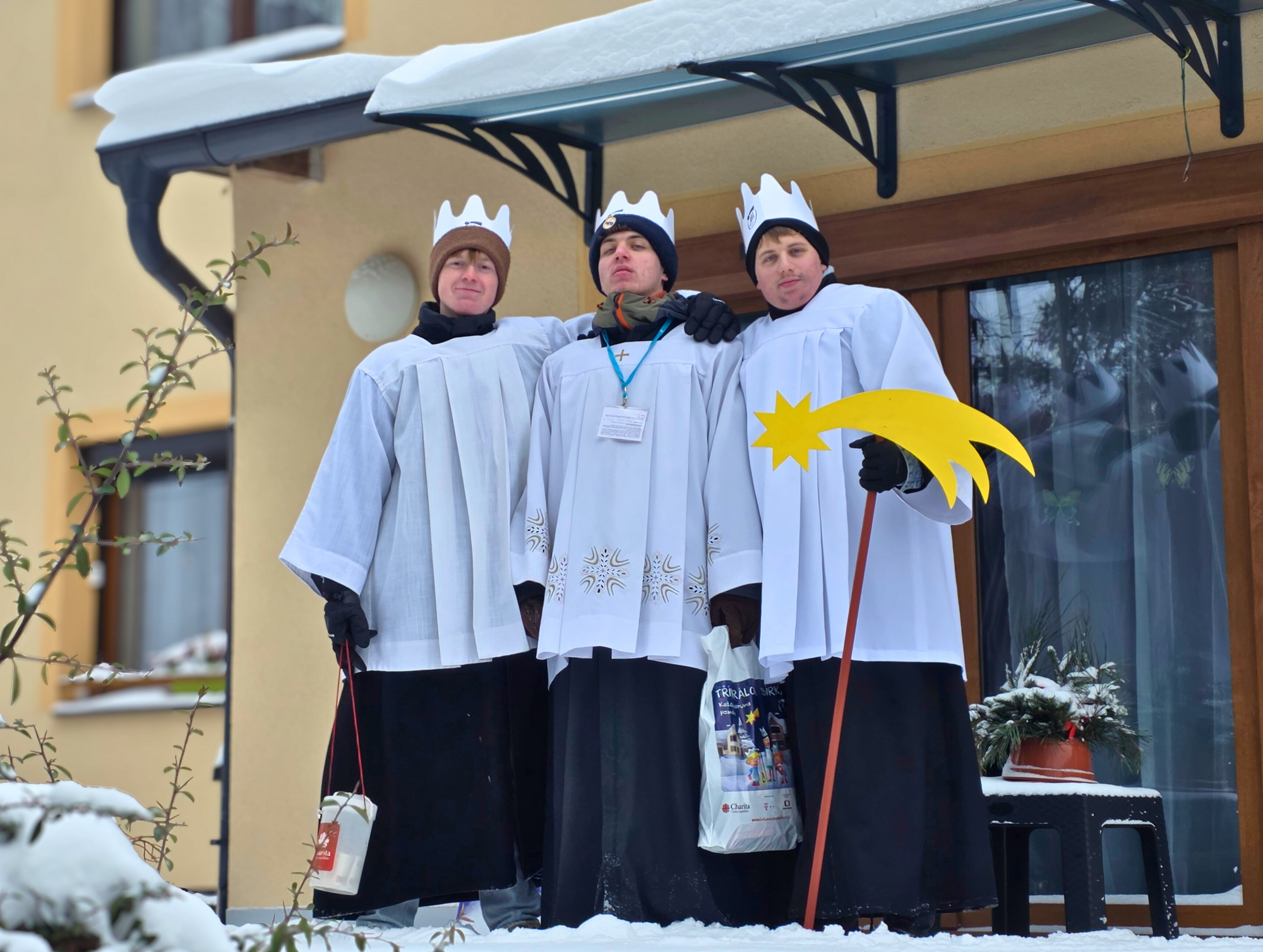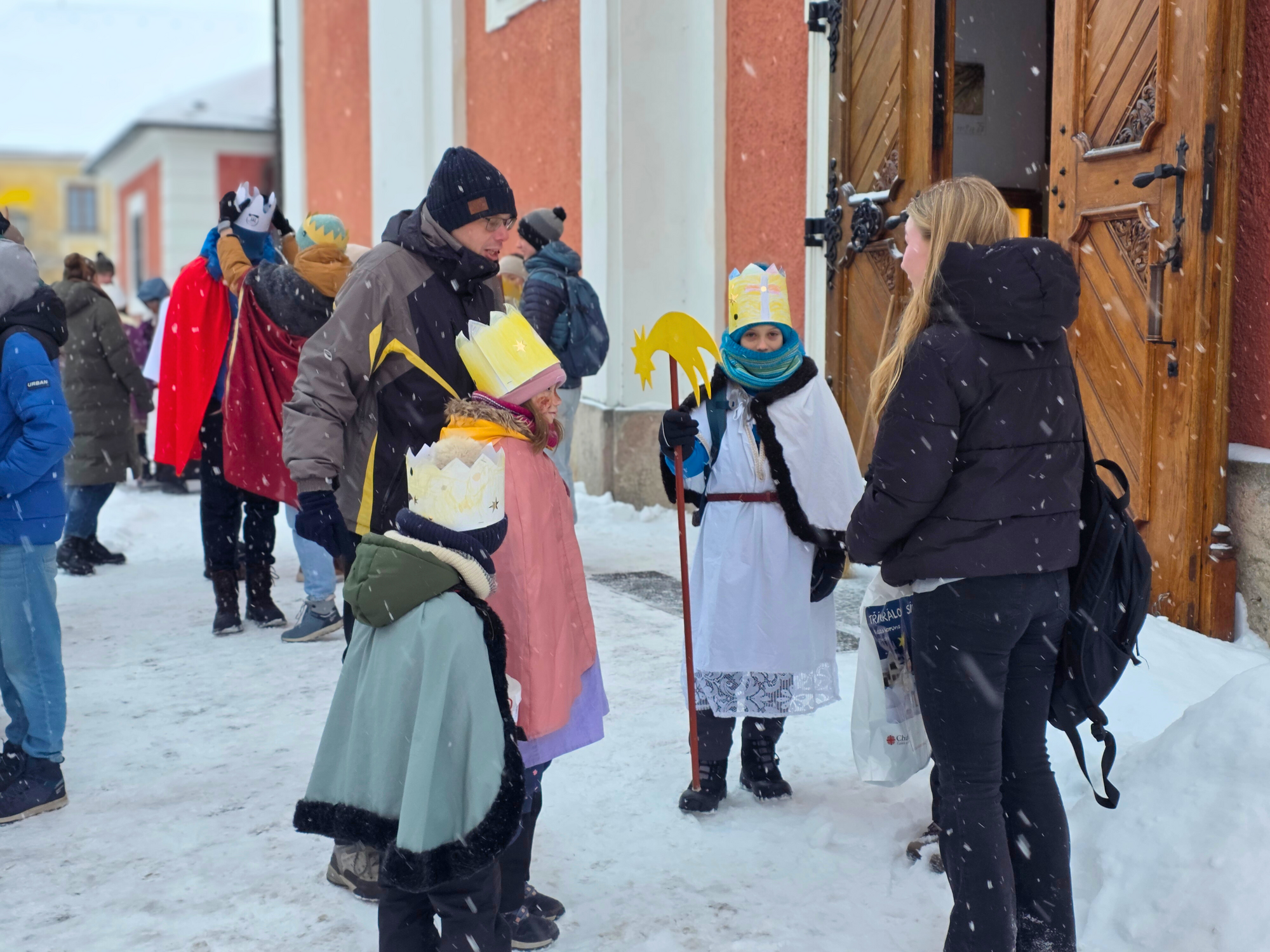 Letos mělo zahájení sbírky u nás výjimečně kouzelnou atmosféru. Po tříkrálové mši svaté nás při odchodu z kostela obklopilo jemné sněžení, které se tiše snášelo do ulic. Zanedlouho už byly vidět další přípravy – malování na obličej, děti s papírovými korunami v kočárcích, skupinky koledníků, které se formovaly před kostelem na společnou fotku.