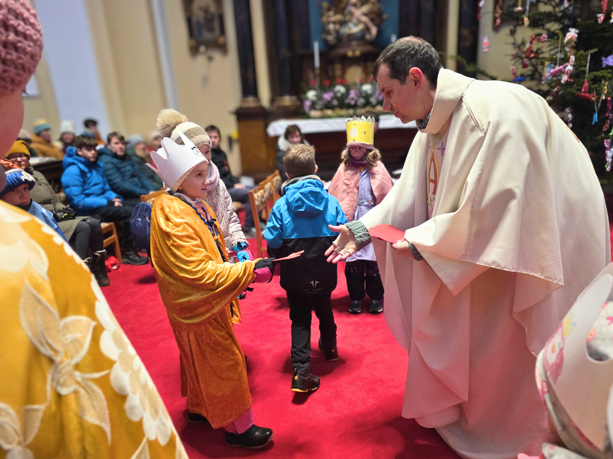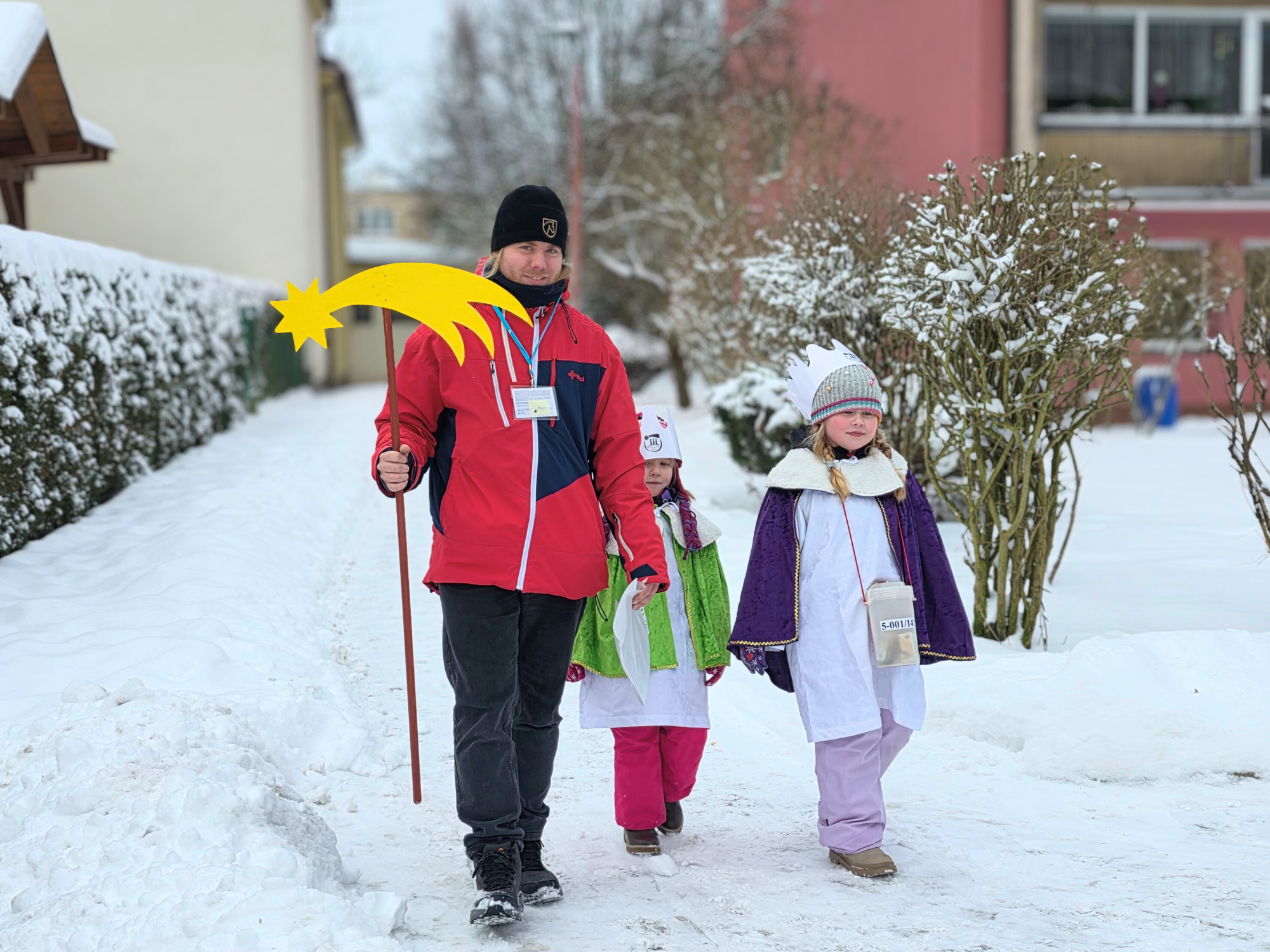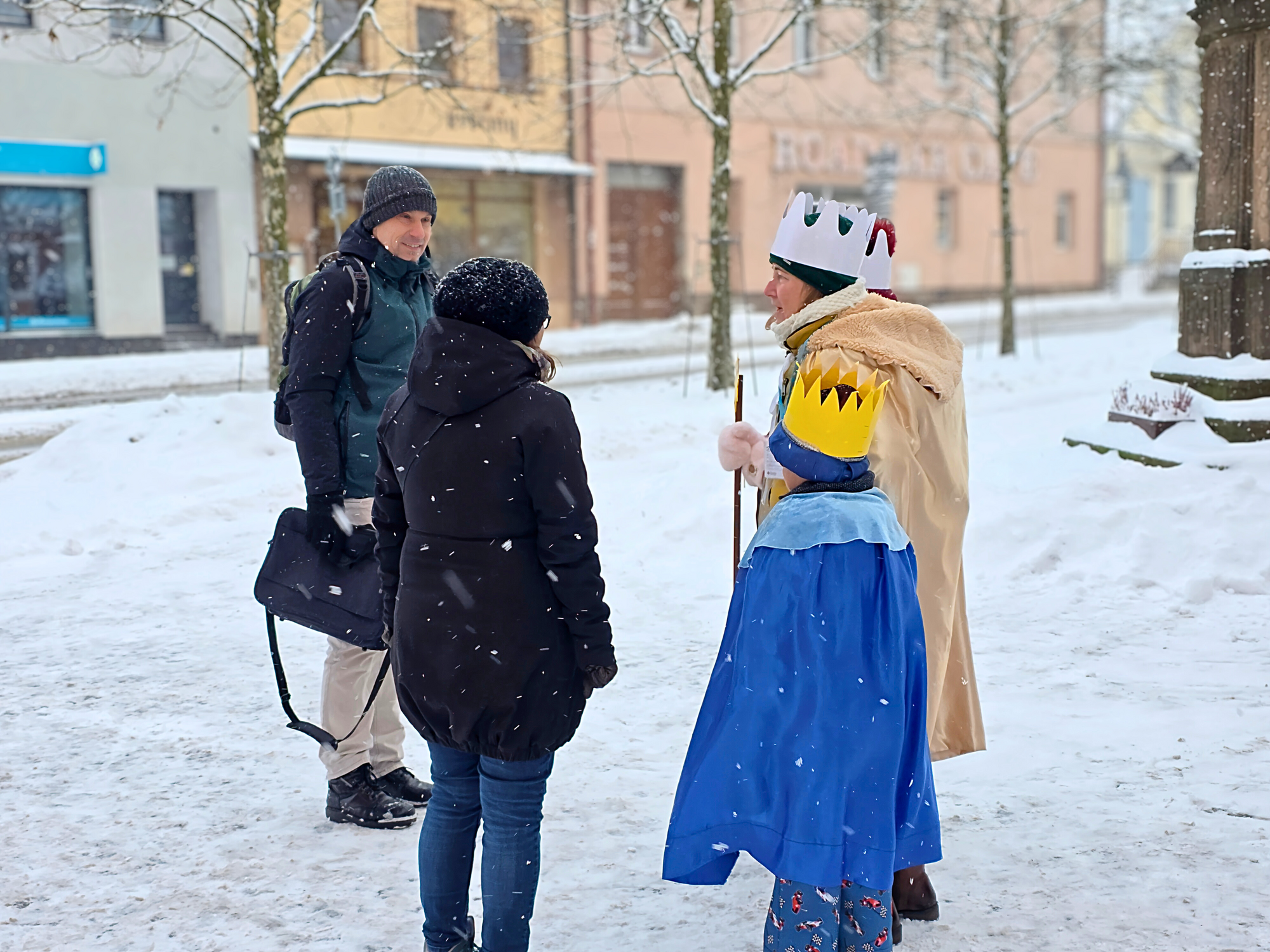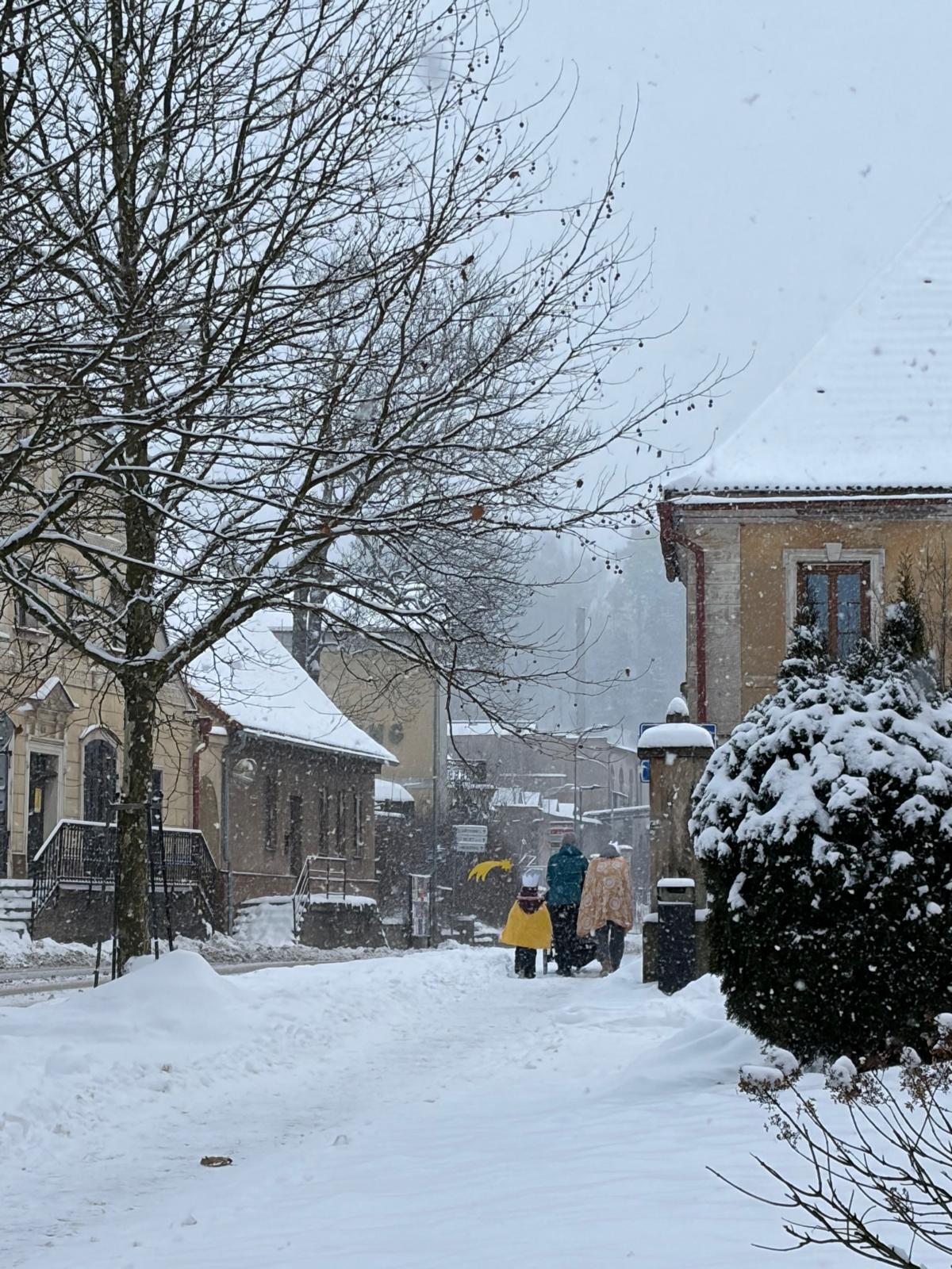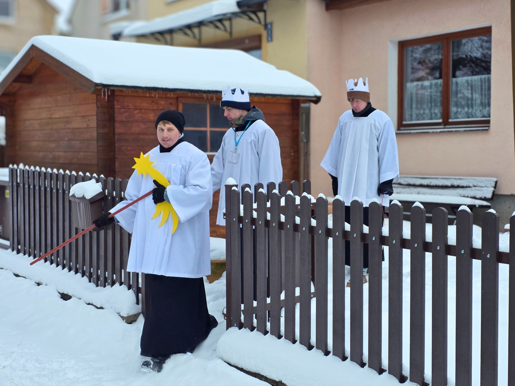 Letos mělo zahájení sbírky u nás výjimečně kouzelnou atmosféru. Po tříkrálové mši svaté nás při odchodu z kostela obklopilo jemné sněžení, které se tiše snášelo do ulic. Zanedlouho už byly vidět další přípravy – malování na obličej, děti s papírovými korunami v kočárcích, skupinky koledníků, které se formovaly před kostelem na společnou fotku.